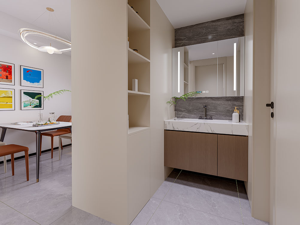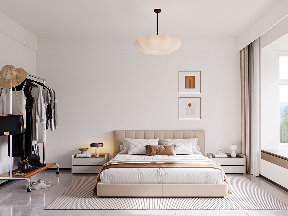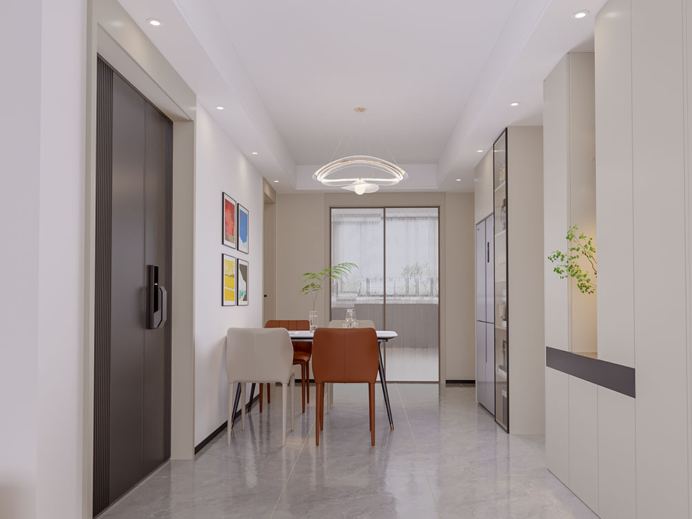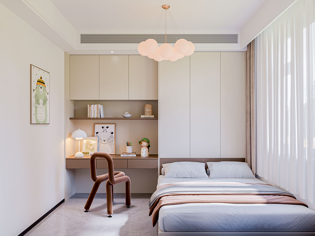 ??濟南阿達森裝飾為萬象東方設計的現代簡約風裝修,以淺米色系打底,整面定制柜藏起雜亂的隱形收納巧思,正契合濟南寫字樓辦公室裝修里的高效空間利用邏輯;懸浮式電視柜的輕盈感,弱化了厚重感;環形吊燈勾勒柔和氛圍、通透紗簾引自然光漫入的設計,和濟南小型辦公室裝修里借光擴空間的思路異曲同工,整體既適配萬象東方的通透戶型,又用低飽和色調軟萌軟裝,把都市居所的舒適與松弛精準落地,日常感與精致感剛好平衡。
