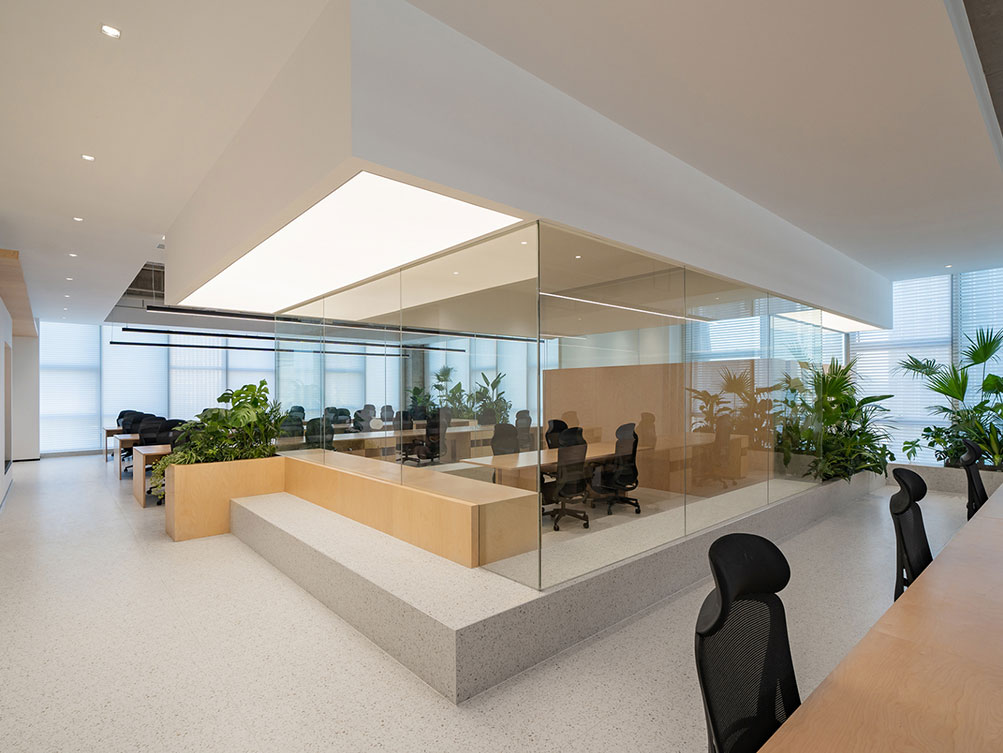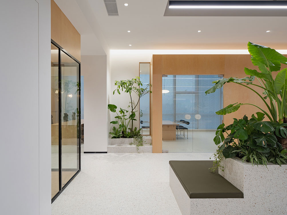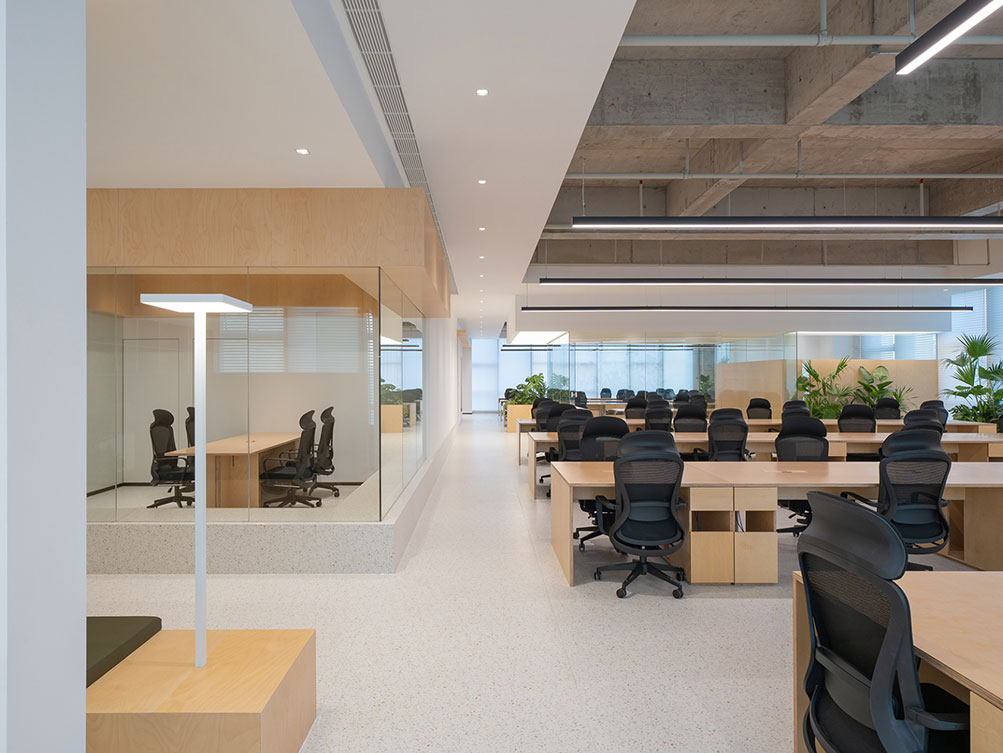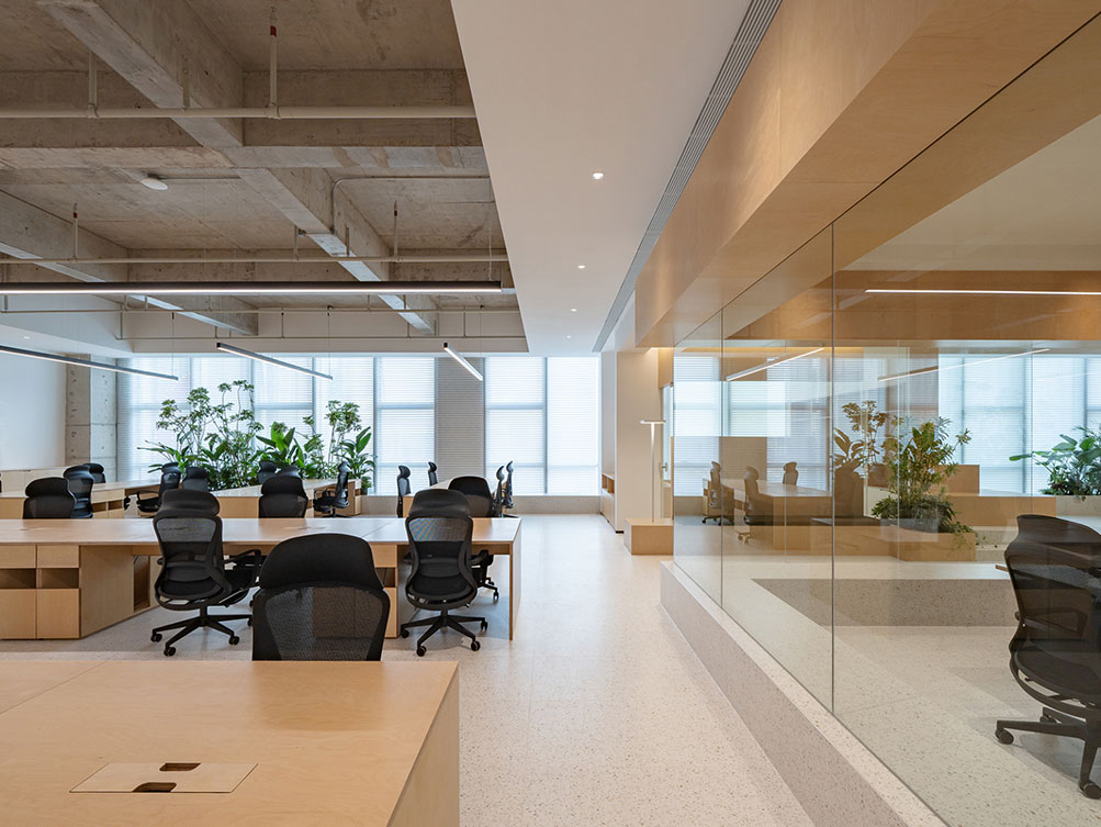 設計理念: 濟南辦公室裝修中傲思拓辦公室以自然共生為核,工業風清水混凝土頂搭配溫潤樺木,玻璃隔斷保障通透。開放區原木長桌適配協作,落地窗引自然光,綠植消解冷感,半開放休閑區兼顧多元場景,既保留空間肌理,又以自然元素營造松弛高效的辦公場域。
