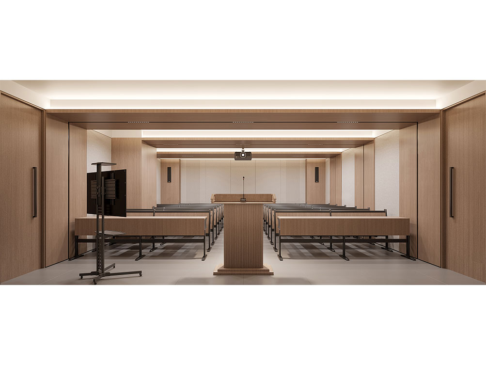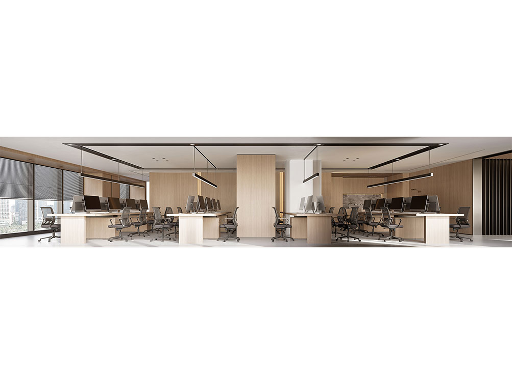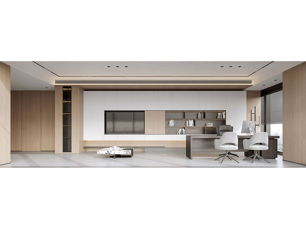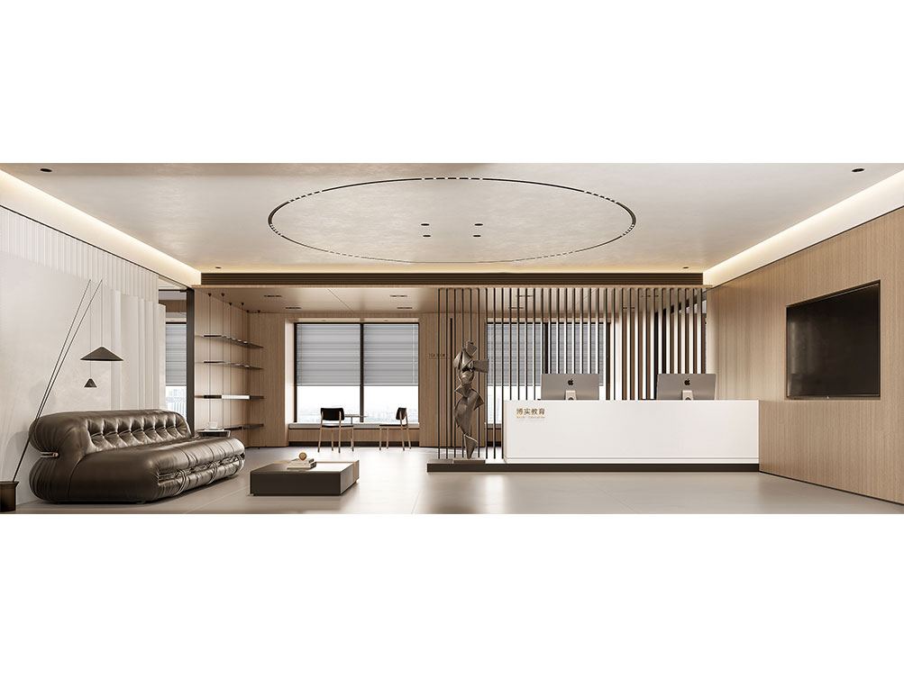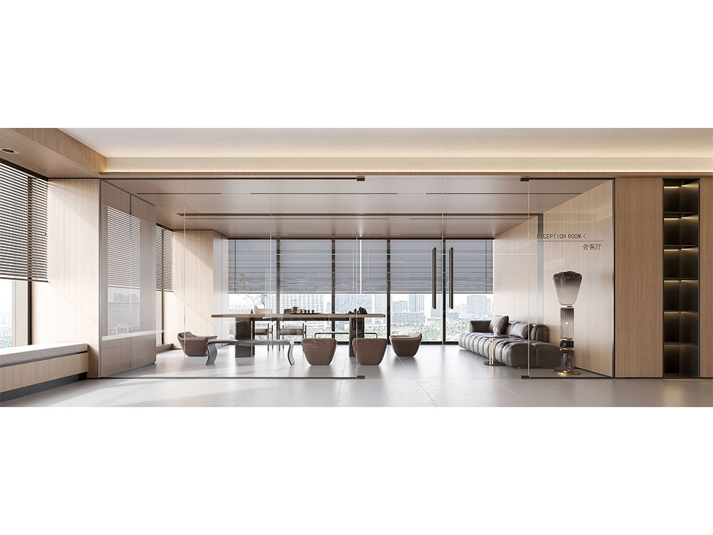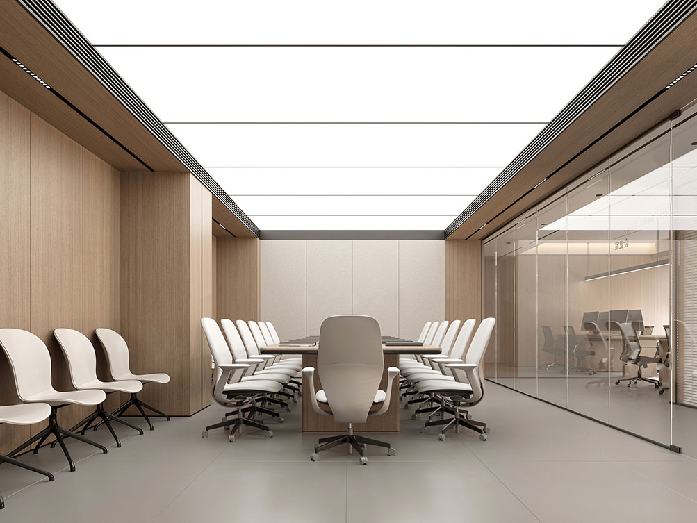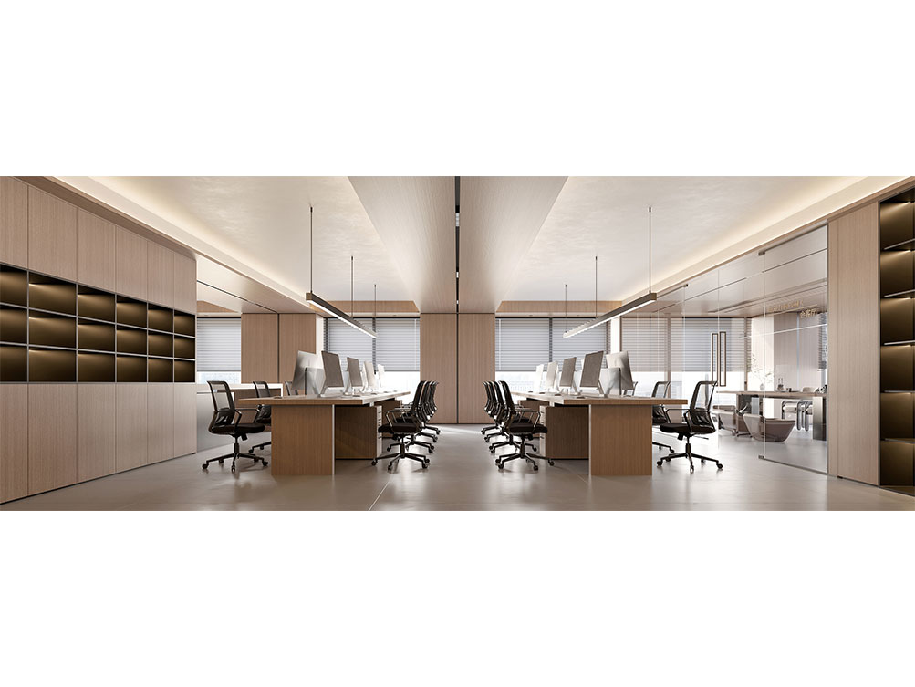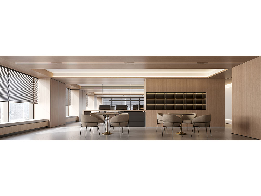 濟南奧克斯中心辦公室以溫潤木調為主線,搭配淺灰地面與嵌入式燈光,打造出濟南辦公室裝修中標志性的簡奢氛圍。開放式長桌適配團隊協作,玻璃隔斷既保障通透又劃分功能區,嵌入式柜體兼顧收納與美學,結合柔光設計,契合濟南商務空間 “實用 + 質感” 的裝修需求,是濟南辦公室裝修中現代高效風的典型呈現。