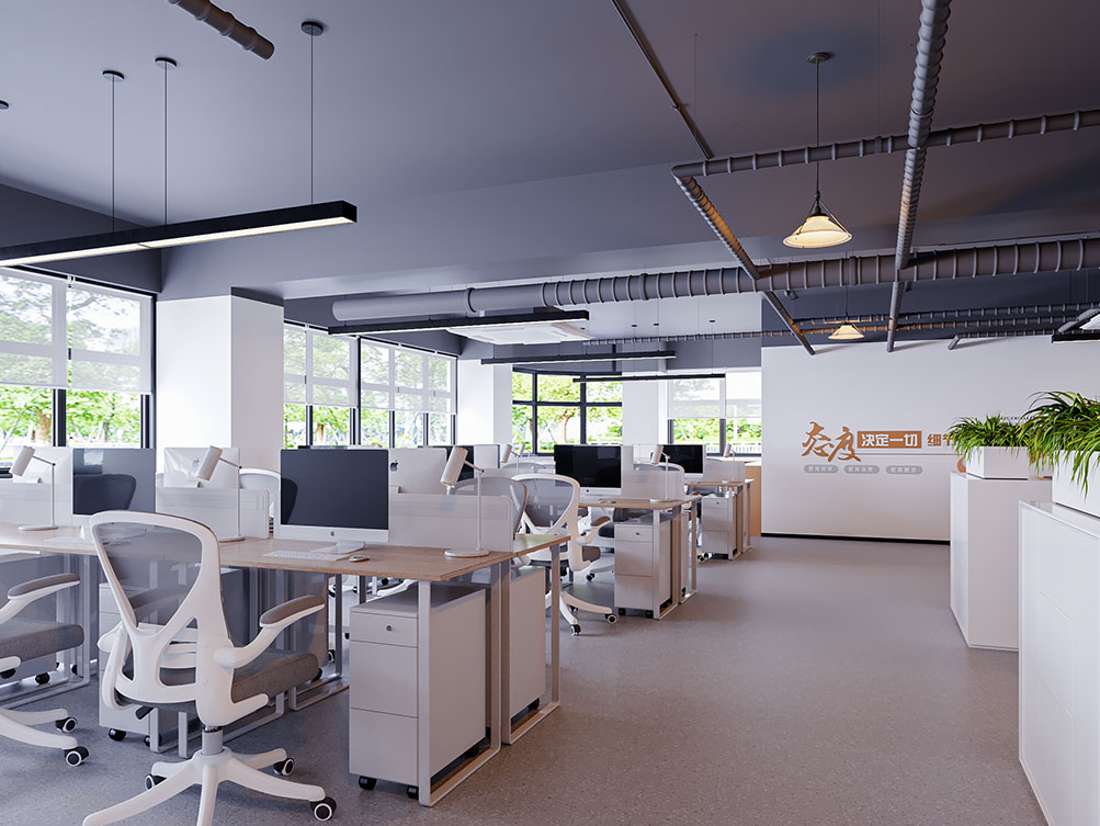 設(shè)計(jì)理念: 作為濟(jì)南辦公室裝修中年輕化辦公空間的代表,博納生物二樓以裸露管道 + 深灰頂?shù)墓I(yè)肌理打底,搭配白調(diào)柜體與原木色工位,平衡冷硬與柔和。白色花箱綠植穿插其間,墻面創(chuàng)意裝飾注入活力,契合濟(jì)南辦公室裝修 “功能 + 美學(xué)” 的設(shè)計(jì)需求,是濟(jì)南科創(chuàng)企業(yè)辦公空間的個(gè)性范本。