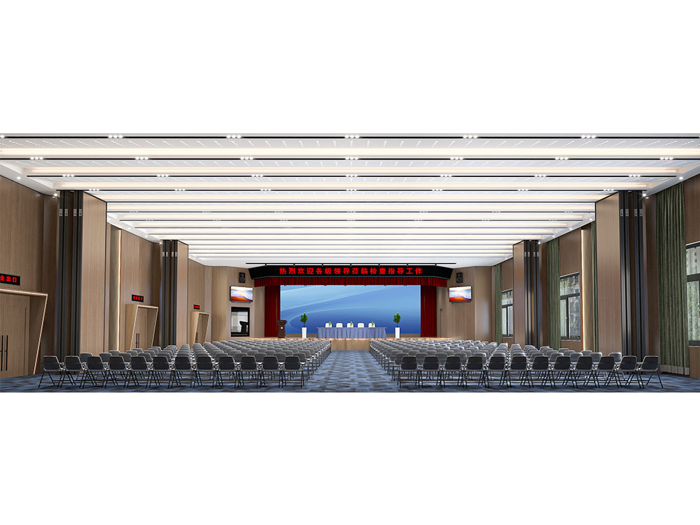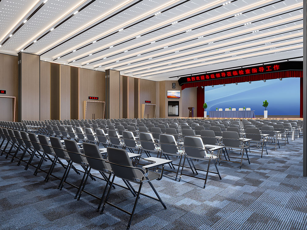 設計理念: 作為濟南辦公室裝修中大型功能空間的代表,該大堂報告廳以沉穩木飾面 + 金屬線條鋪陳基調,頂部穿孔吊頂搭配嵌入式燈光,兼顧聲學與視覺通透感。巨幅電子屏 + 對稱音響設備適配會議、匯報需求,米色座椅與紅色臺階營造莊重又舒適的氛圍,是濟南辦公室裝修中高規格功能空間的典型設計。